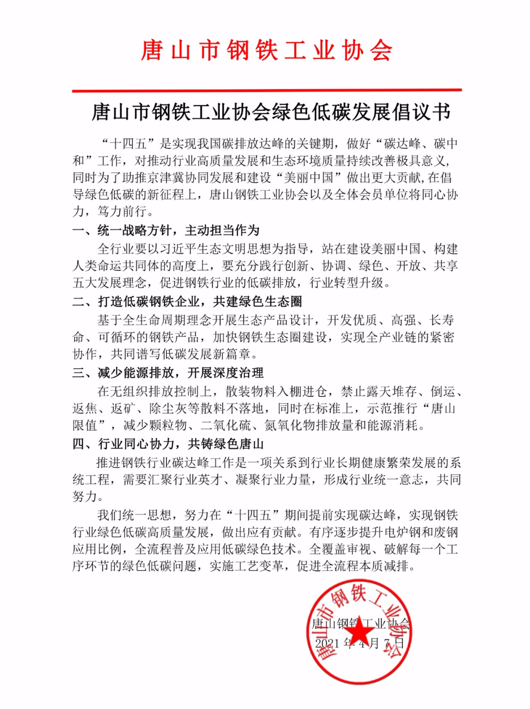 4月9日,《唐山市钢铁工业协会绿色低碳发展倡议书》发布,努力在“十四五”期间提前实现碳达峰,实现钢铁行业绿色低碳高质量发展,做出应有贡献。