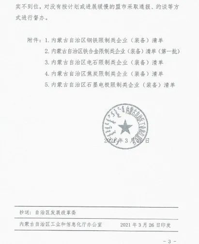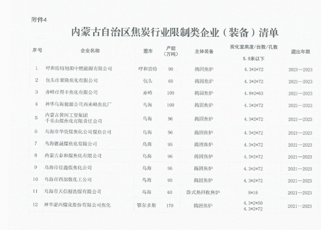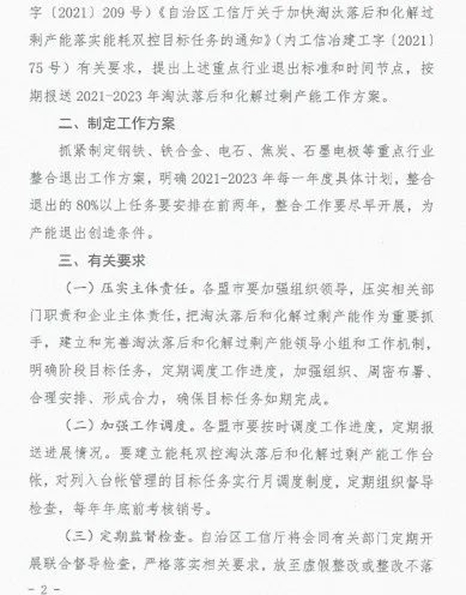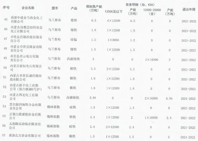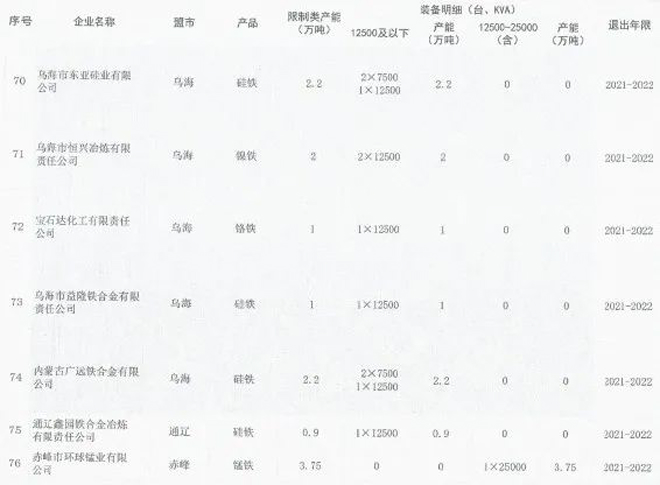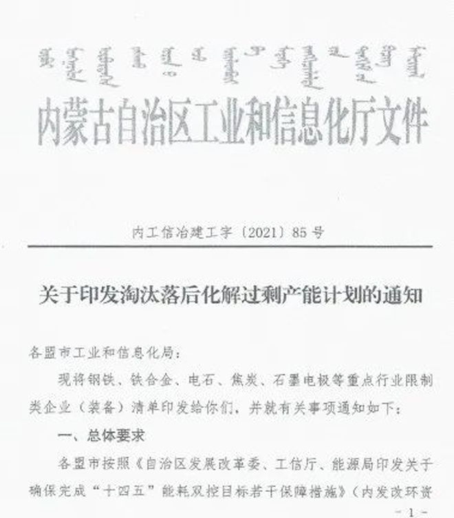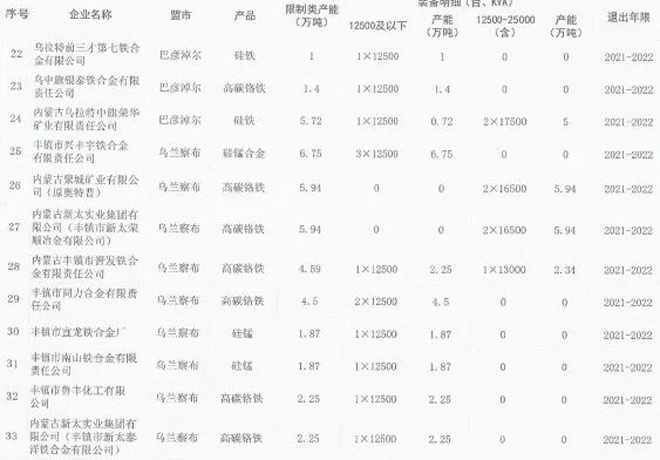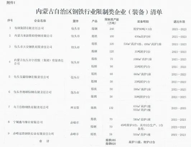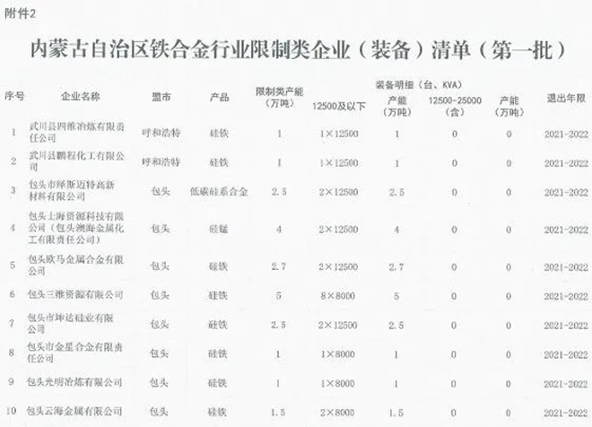 日前,内蒙古自治区工业和信息化厅印发《关于印发淘汰落后化解过剩产能计划的通知》(以下简称《通知》),《通知》要求各盟市抓紧制定铁合金、钢铁行业退出方案,明确2021~2023每一年度具体计划,并要求整合退出的80%以上任务要安排在2021~2022年,整合工作要尽早开展,为产能退出创造条件。