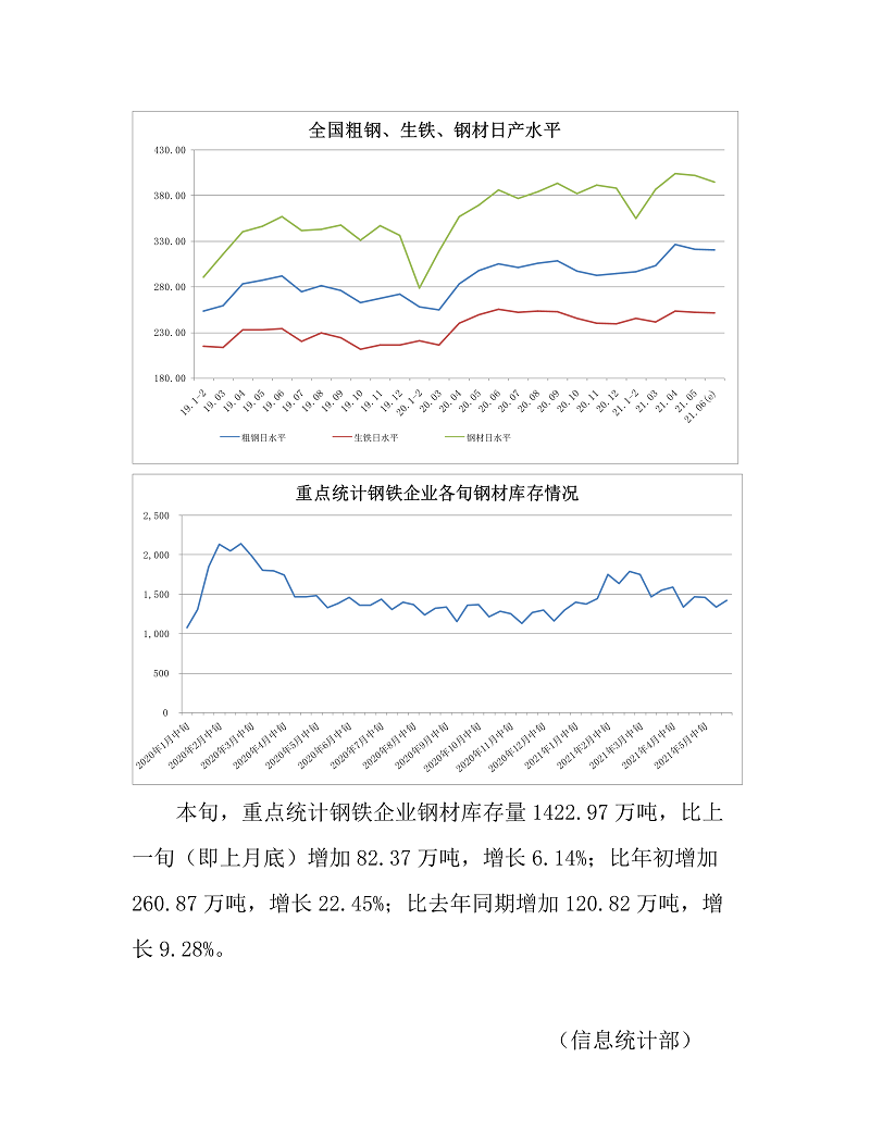 据中钢协最新数据显示,2021年6月上旬,重点统计钢铁企业粗钢日均产量233.53万吨,环比增长2.15%、同比增长13.33%;钢材库存量1422.97万吨,比上一旬(即上月底)增加82.37万吨,增长6.14%。