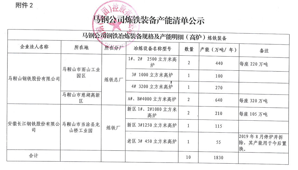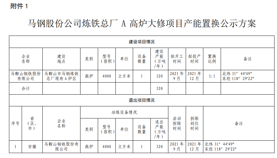按照《国务院关于化解产能严重过剩矛盾的指导意见》《国务院关于钢铁行业化解过剩产能实现脱困发展的意见》和《钢铁行业产能置换实施办法》要求,现将马鞍山钢铁股份有限公司炼铁总厂A、B高炉大修项目产能置换方案的予以公示,欢迎社会公众进行监督。公示期为2021年6月18日—2021年7月15日。如有异议,请于公示期内向我厅原材料工业处反馈。