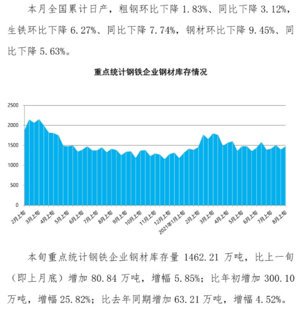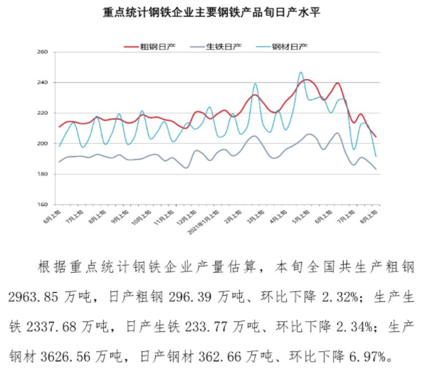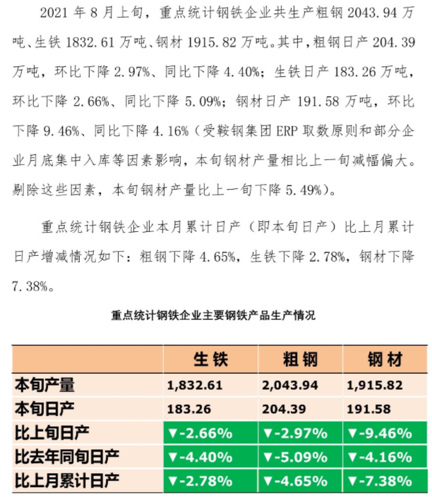中国钢铁工业协会数据显示,2021年8月上旬,重点统计钢铁企业共生产粗钢2043.94万吨、生铁1832.61万吨、钢材1915.82万吨。其中,粗钢日产204.39万吨,环比下降2.97%、同比下降4.40%;生铁日产183.26万吨,环比下降2.66%、同比下降5.09%;钢材日产191.58万吨,环比下降9.46%、同比下降4.16%。