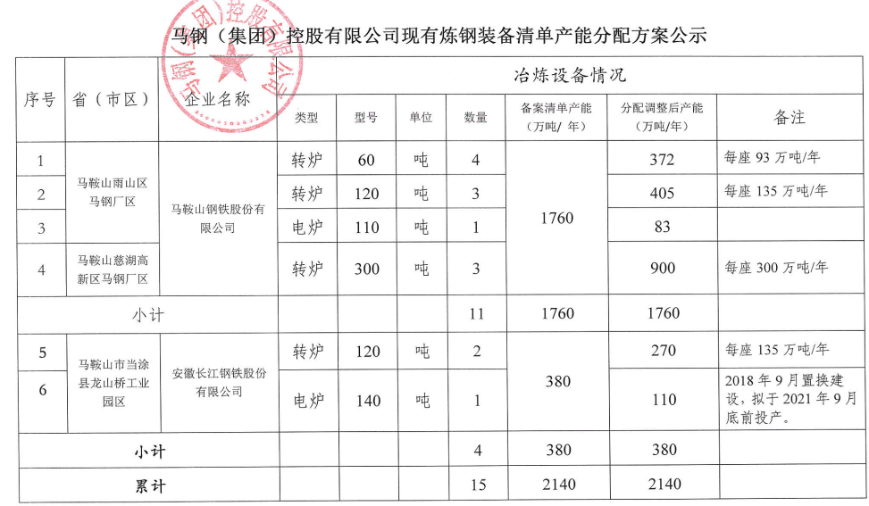 按照《国务院关于化解产能严重过剩矛盾的指导意见》《国务院关于钢铁行业化解过剩产能实现脱困发展的意见》和《钢铁行业产能置换实施办法》要求,现将马鞍山钢铁股份有限公司新特钢项目2×150吨转炉产能置换方案予以公示;同时,将我厅2018年9月6日《关于马钢(集团)控股有限公司产能置换方案的公告》中部分内容(马鞍山钢铁股份有限公司2×100吨电弧炉产能置换方案)予以废止。欢迎社会公众进行监督。