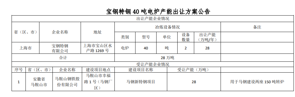 按照《国务院关于化解产能严重过剩矛盾的指导意见》、《国务院关于钢铁行业化解过剩产能实现脱困发展的意见》和《钢铁行业产能置换实施办法》要求,经国务院国资委(国资厅改革〔2021〕240号)复函同意,拟将宝钢特钢2座40吨电炉产能出让。现将宝钢特钢2座40吨电炉对应28万吨炼钢产能出让方案予以公告,欢迎社会公众进行监督。