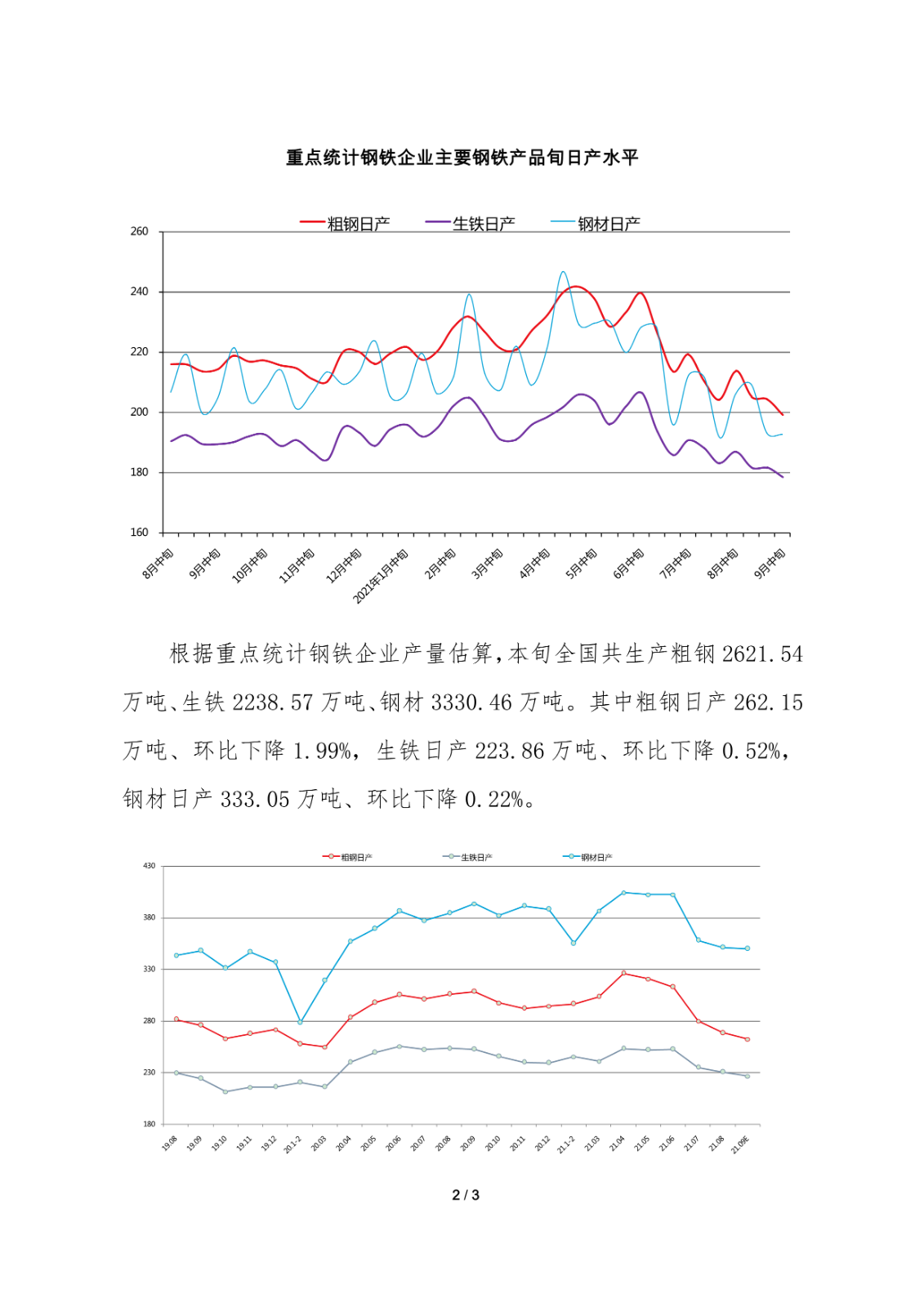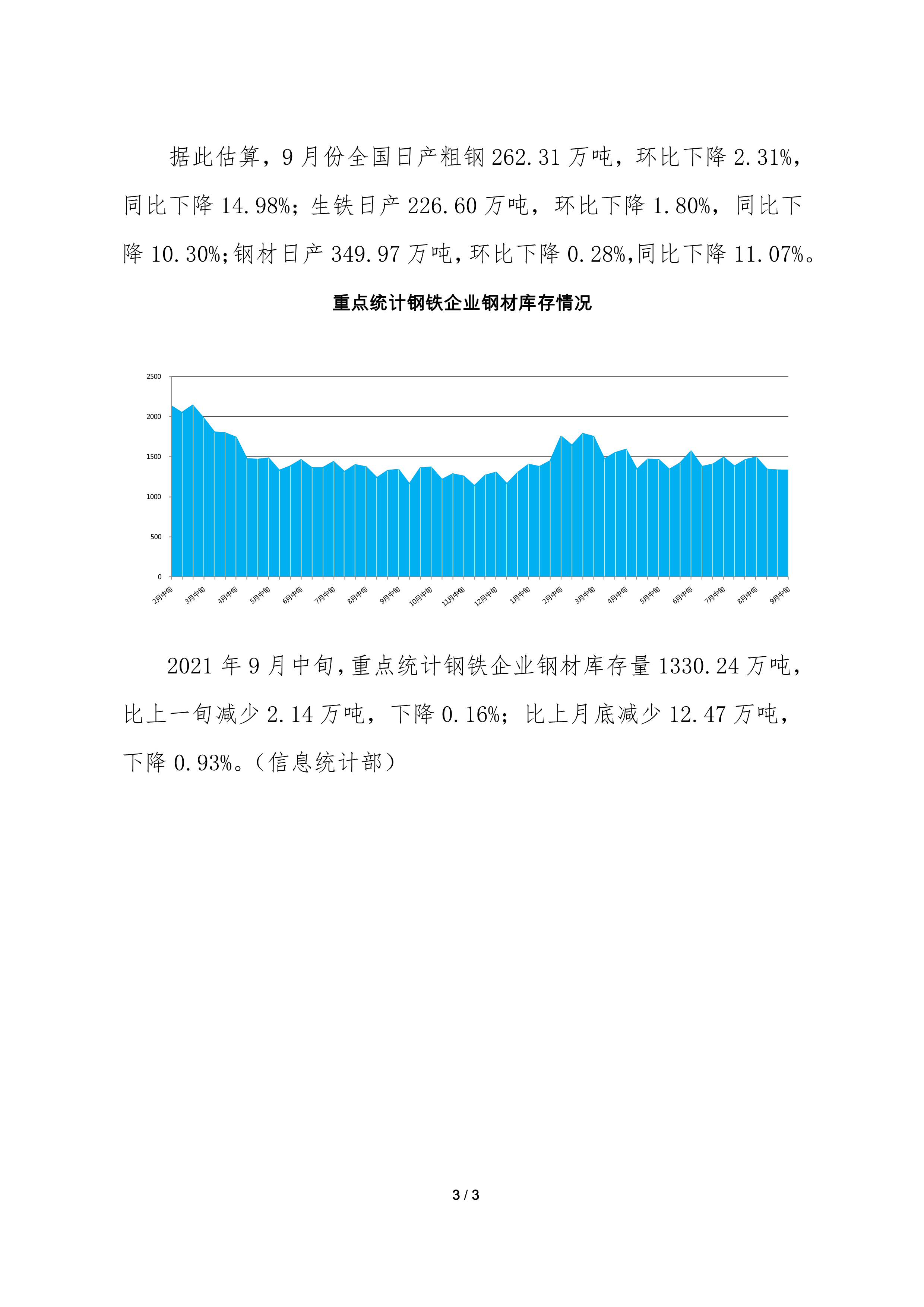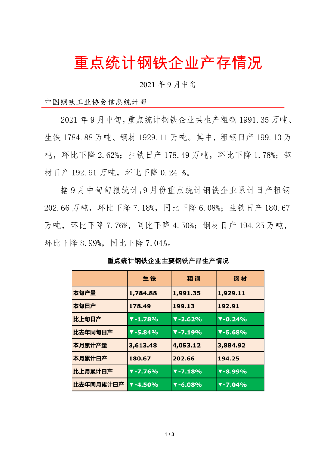 据中钢协最新数据显示,9月中旬重点钢企粗钢日产199.13万吨,环比下降2.62%、同比下降7.19%;钢材库存量1330.24万吨,比上一旬减少2.14万吨,降低0.16%。