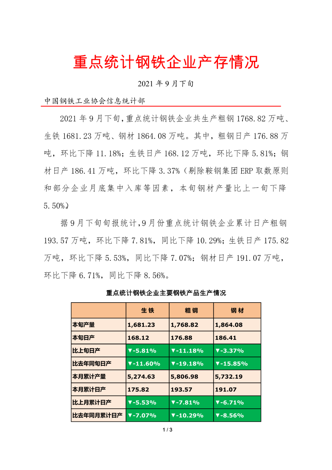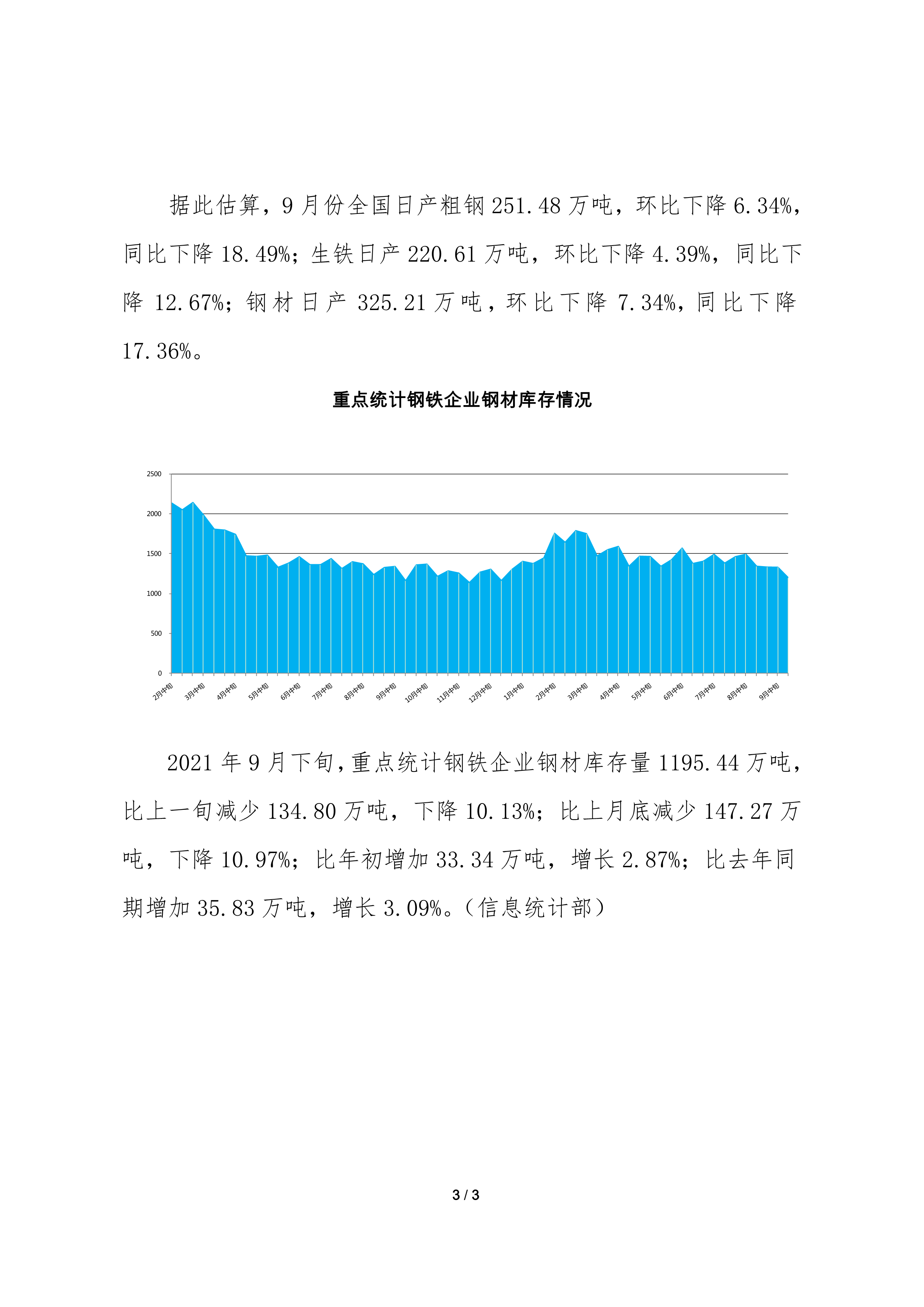 据中钢协最新数据显示,9月下旬重点钢企粗钢日产176.88万吨,环比下降11.18%、同比下降19.18%;钢材库存量1195.44万吨,比上一旬减少134.80万吨,下降10.13%。