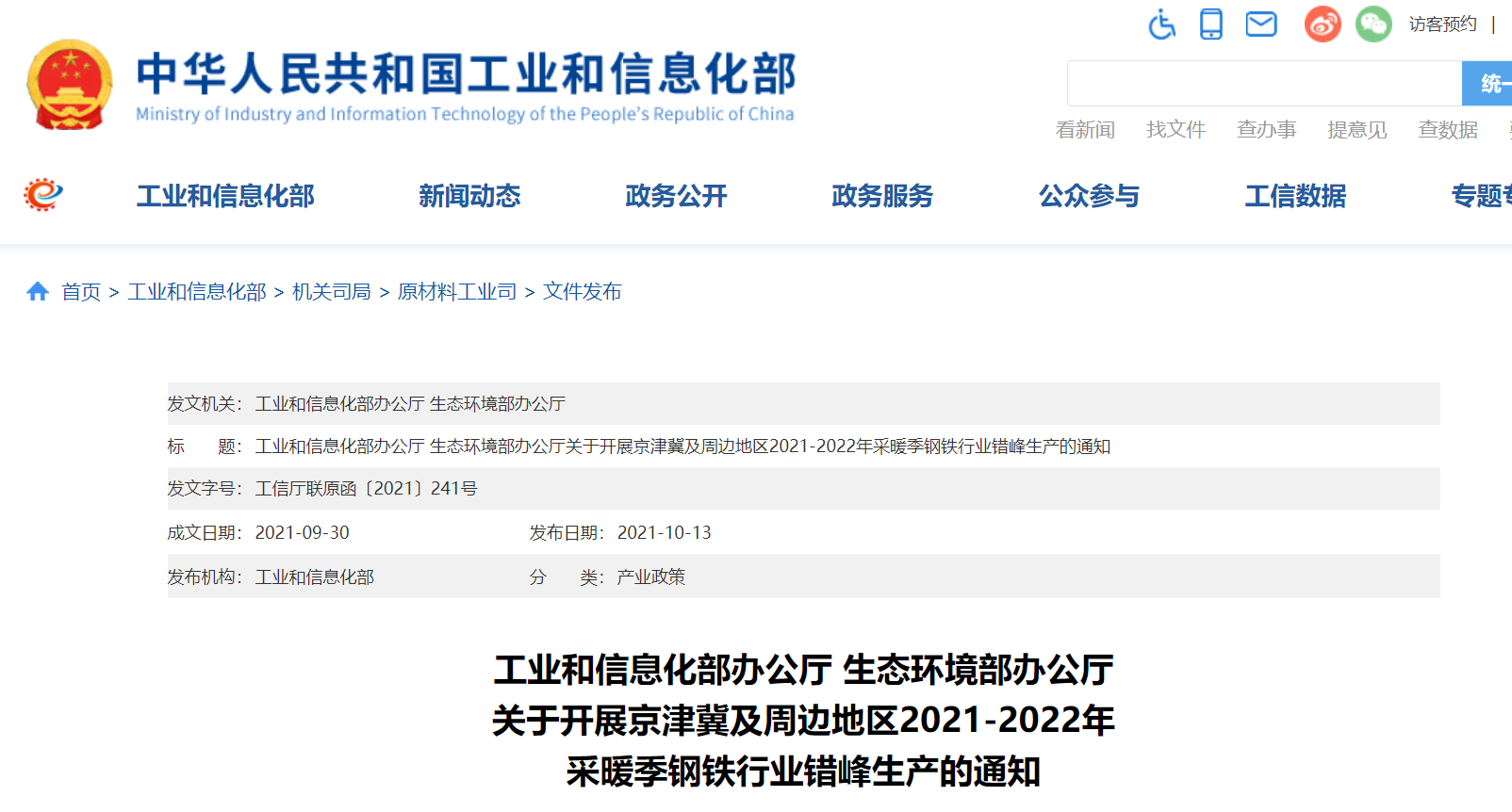 关于开展京津冀及周边地区2021-2022年采暖季钢铁行业错峰生产的通知