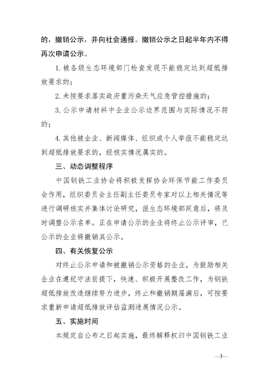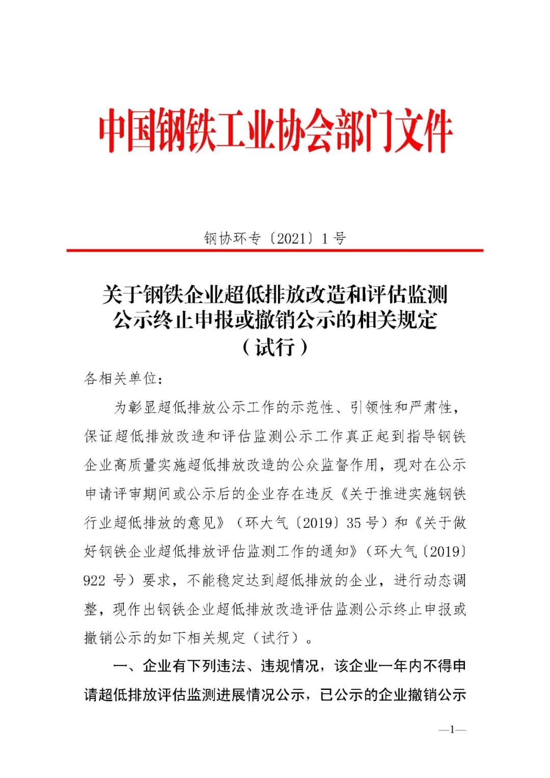 中钢协11月15日发布《关于钢铁企业超低排放改造和评估监测公示终止申报或撤销公示的相关规定(试行)》。对在公示申请评审期间或公示后的企业存在违反《关于推进实施钢铁行业超低排放的意见》(环大气〔2019〕35号和《关于做好钢铁企业超低排放评估监测工作的通知》(环大气〔2019〕922号)要求,不能稳定达到超低排放的企业,进行动态调整,现作出钢铁企业超低排放改造评估监测公示终止申报或撤销公示的如下相关规定(试行)。