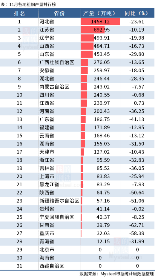 ◎ 国家统计局:11月,全国14省市粗钢产量同比降幅超20%。其中河北降23.61%、山东降29.80%,湖北降28.35%、河南降36.25%。