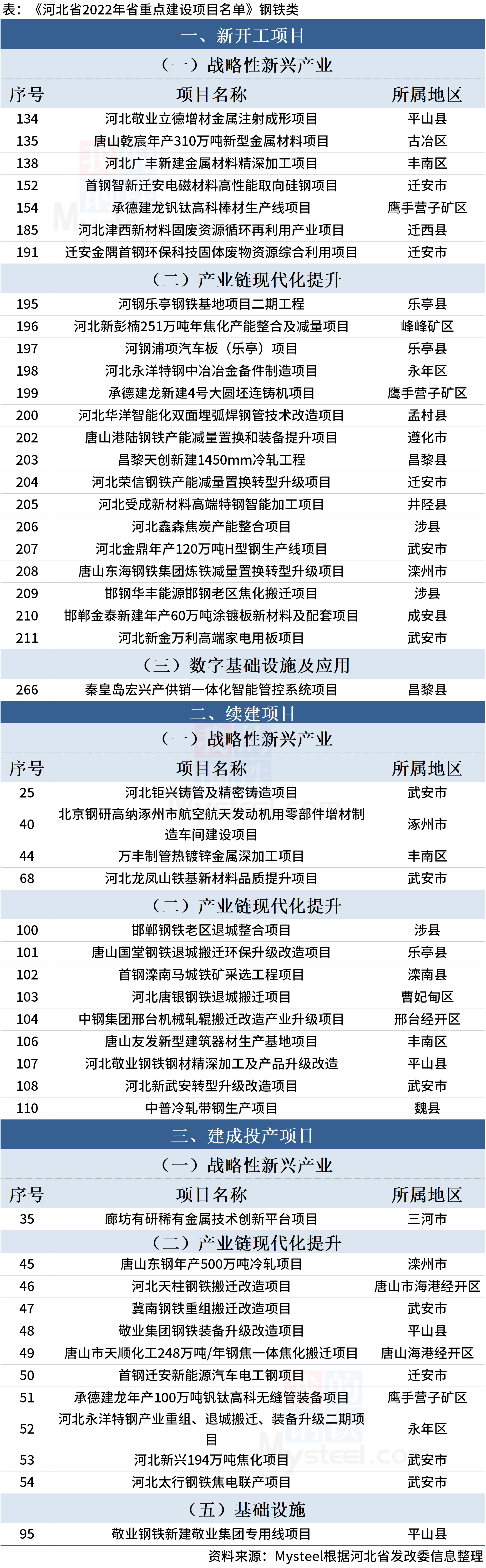 1月6日,河北省发展改革委印发《河北省2022年省重点建设项目名单》。名单共涉及2022年省重点建设项目695项,总投资1.12万亿元。其中,涉及钢铁项目及相关49个,具体名单如下: