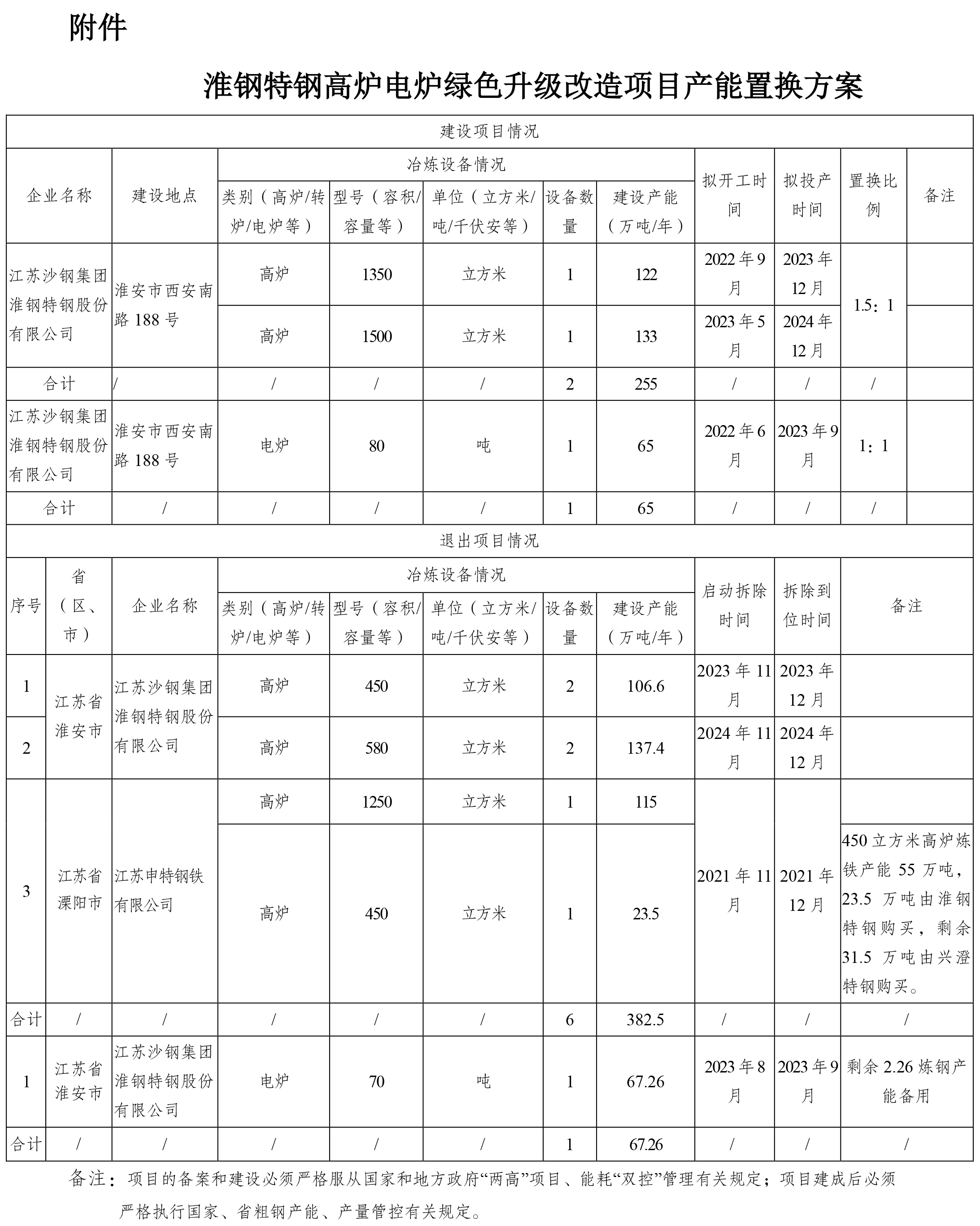 沙钢集团淮钢特钢高炉电炉绿色升级改造项目产能置换方案公告