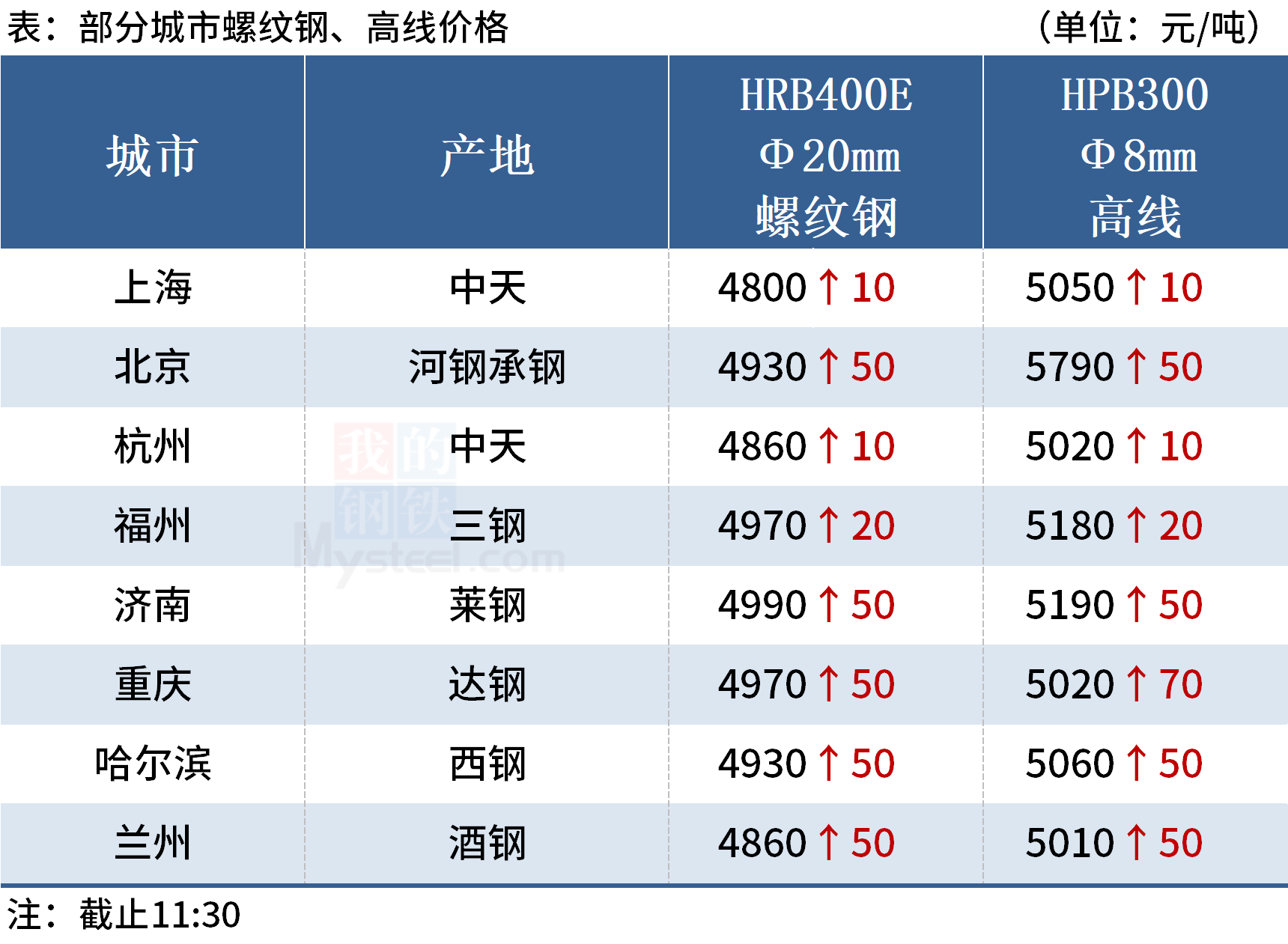 ◎上海:8日早盘建材市场价格上涨10。现螺纹4730-4770,西城抗震4780,其他4650-4710,兴鑫抗震4720,联鑫黄海抗震4730,盘螺4850-5050,高线亚新4750。(单位:元/吨)