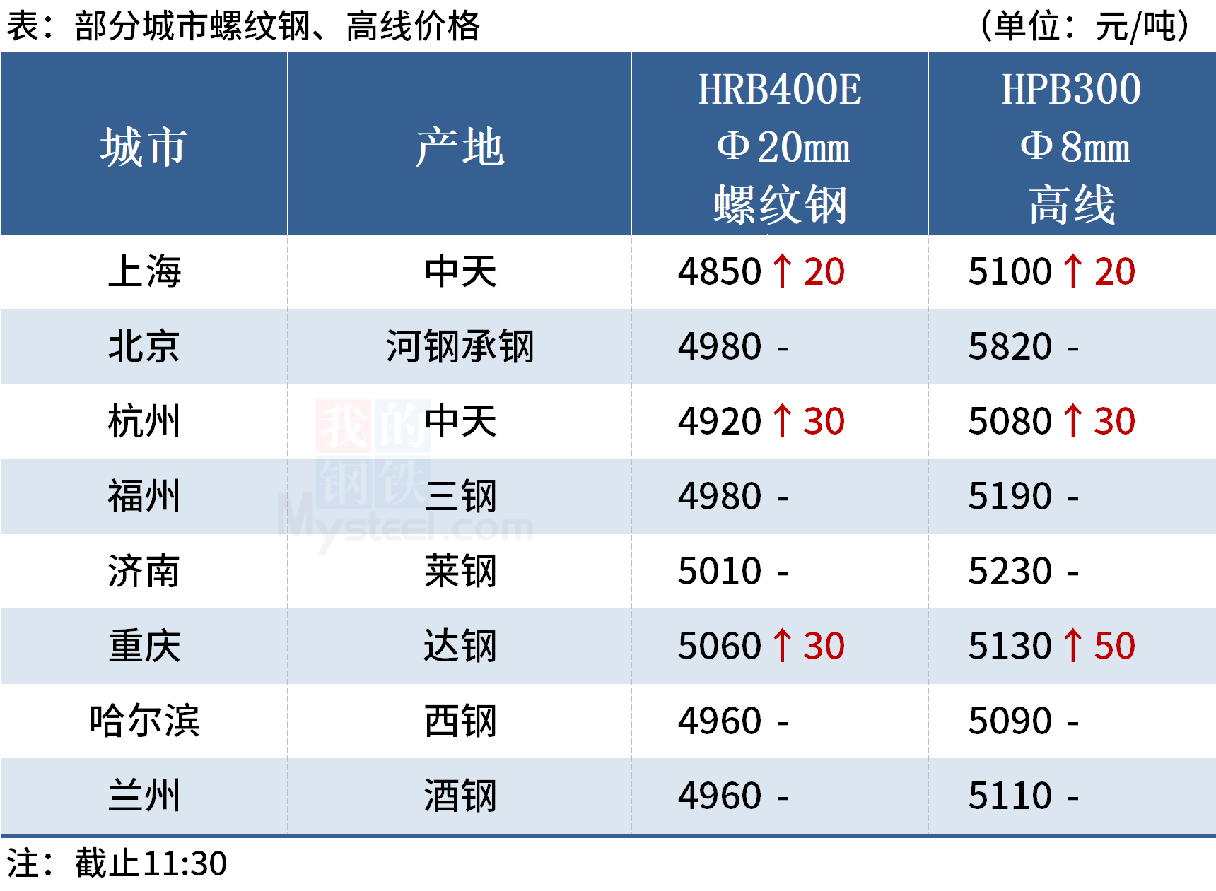 ◎上海:10日早盘建材市场价格上涨20。现螺纹4780-4820,西城抗震4830,其他4700-4760,兴鑫抗震4770,联鑫黄海抗震4780,盘螺4900-5100,高线亚新4800。(单位:元/吨)