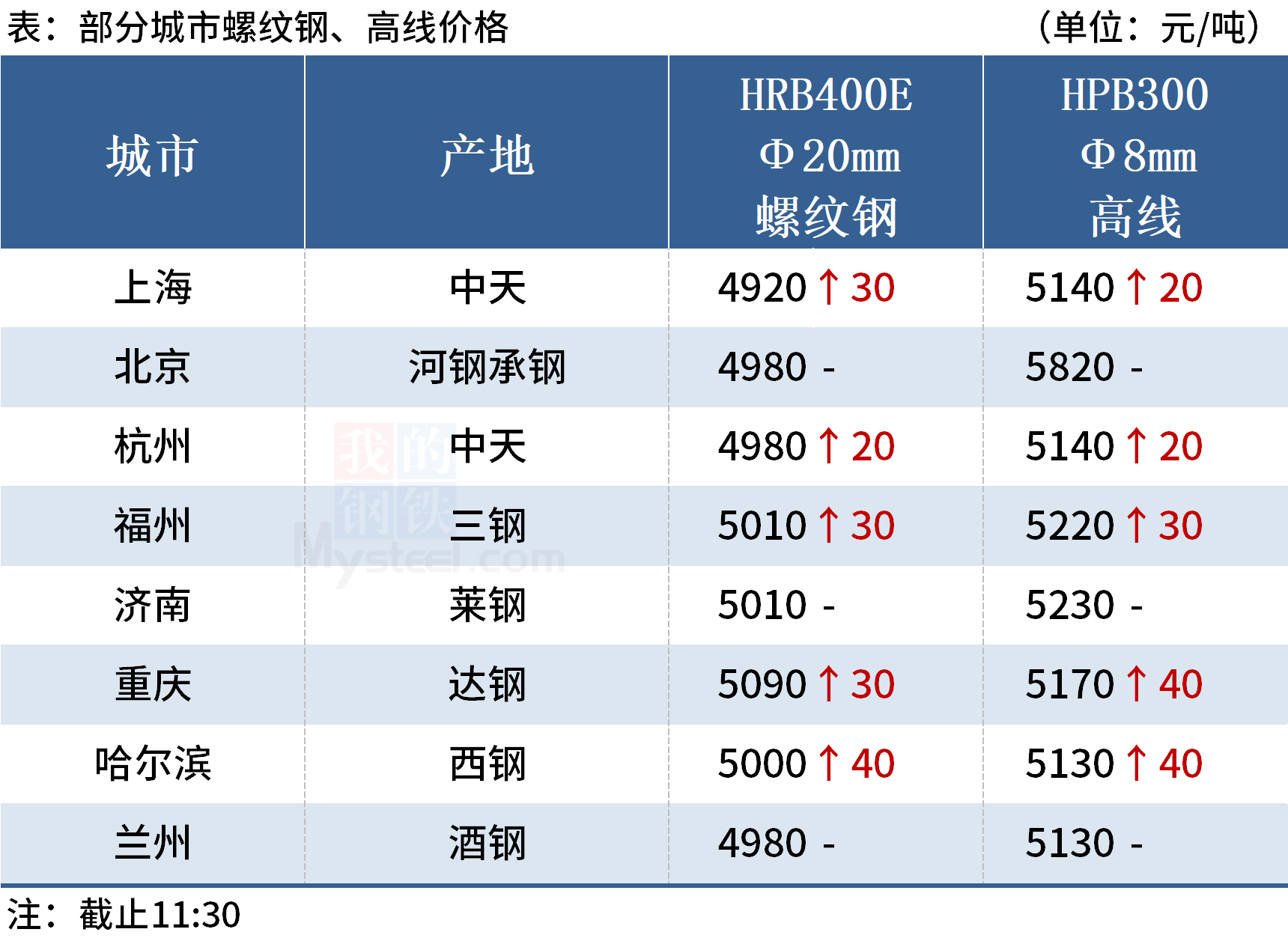 ◎上海:11日早盘建材市场价格上涨20-30。现螺纹4850-4890,西城抗震4890,其他4760-4820,兴鑫抗震4830,联鑫黄海抗震4840,盘螺4970-5140,高线亚新4870。(单位:元/吨)