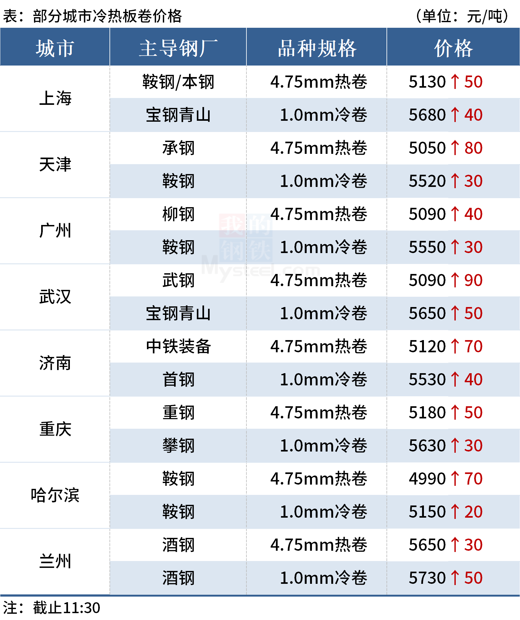 ◎乐从:11日早盘热卷市场价格上涨40,4.75以上普柳燕5090-5100,2.75普5130-5280锰5280-5300。(单位:元/吨)
