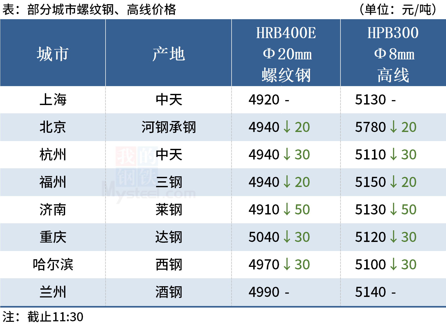 ◎重庆:15日早盘建材市场价格跌30,现达钢螺4990、盘5120,永航螺4970、盘5030,泸钢螺4970、盘5030。(单位:元/吨)