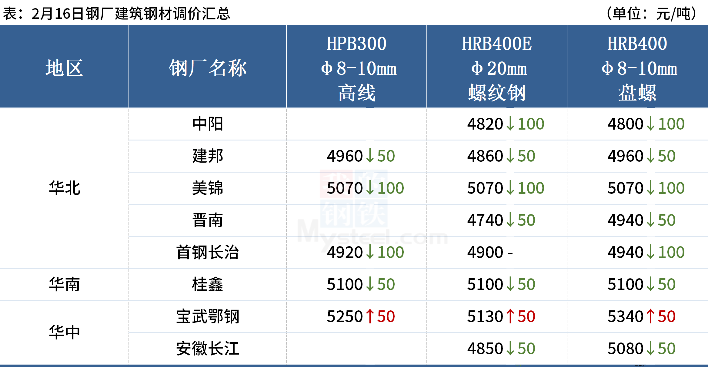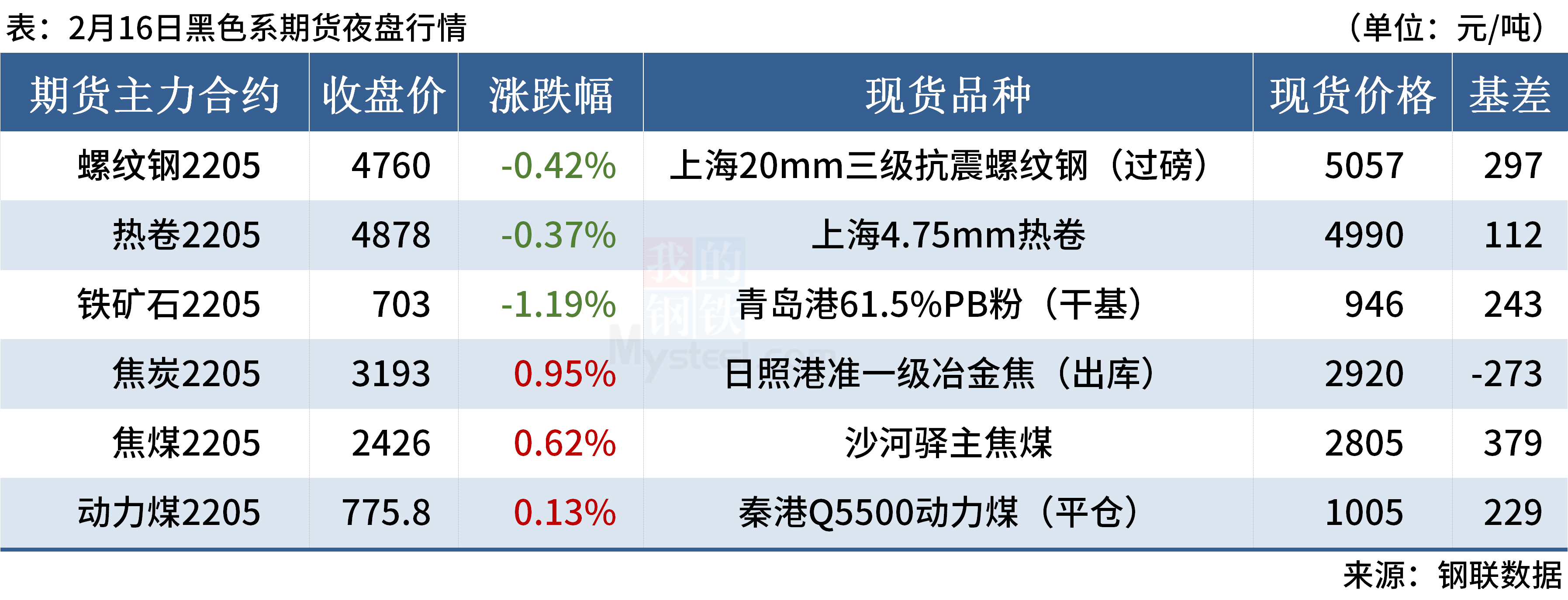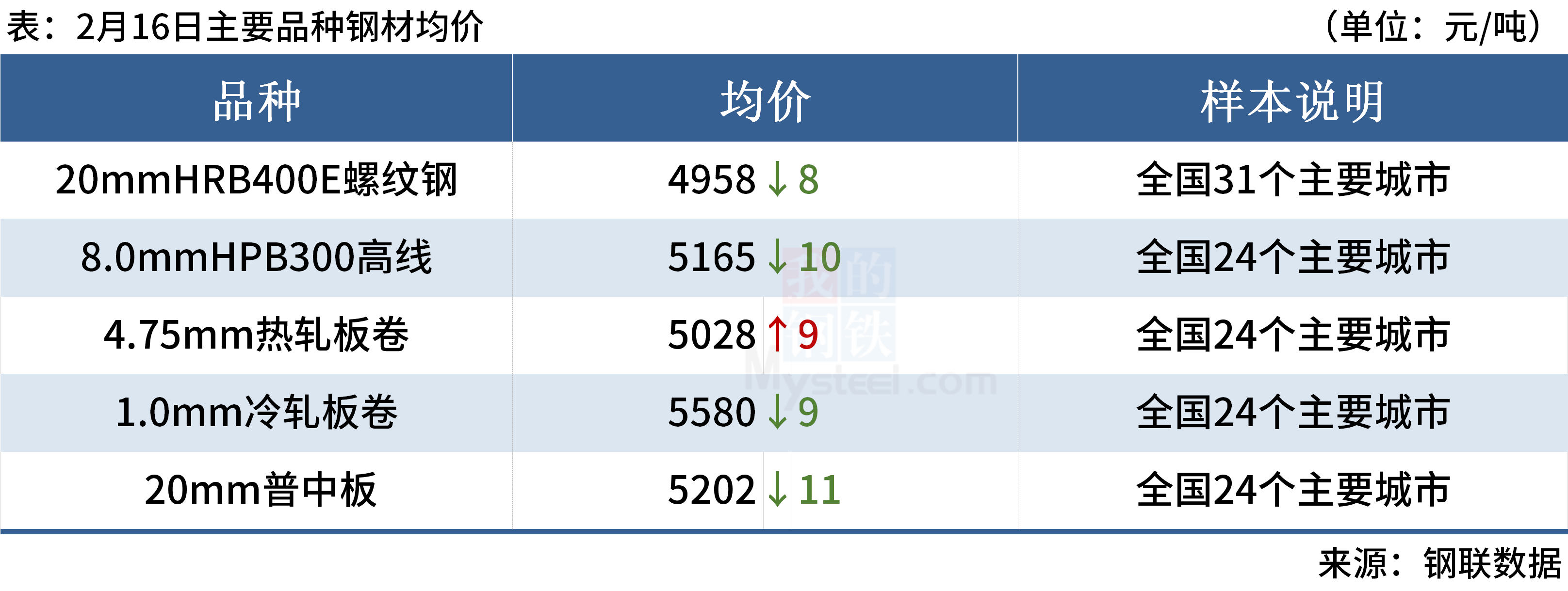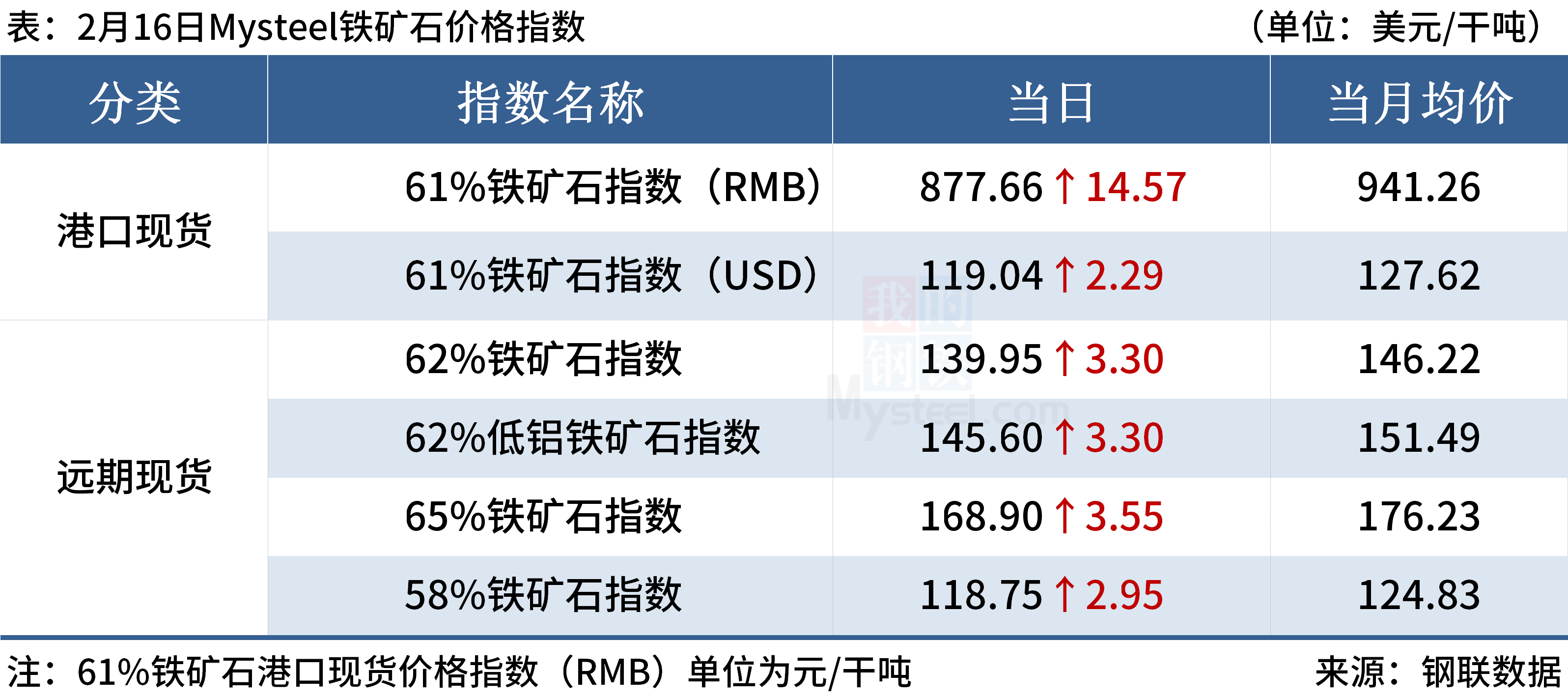 ◎ 2月16日,全国主港铁矿石成交135万吨,环比增214%;237家主流贸易商建材成交8.51万吨,环比增82.3%。