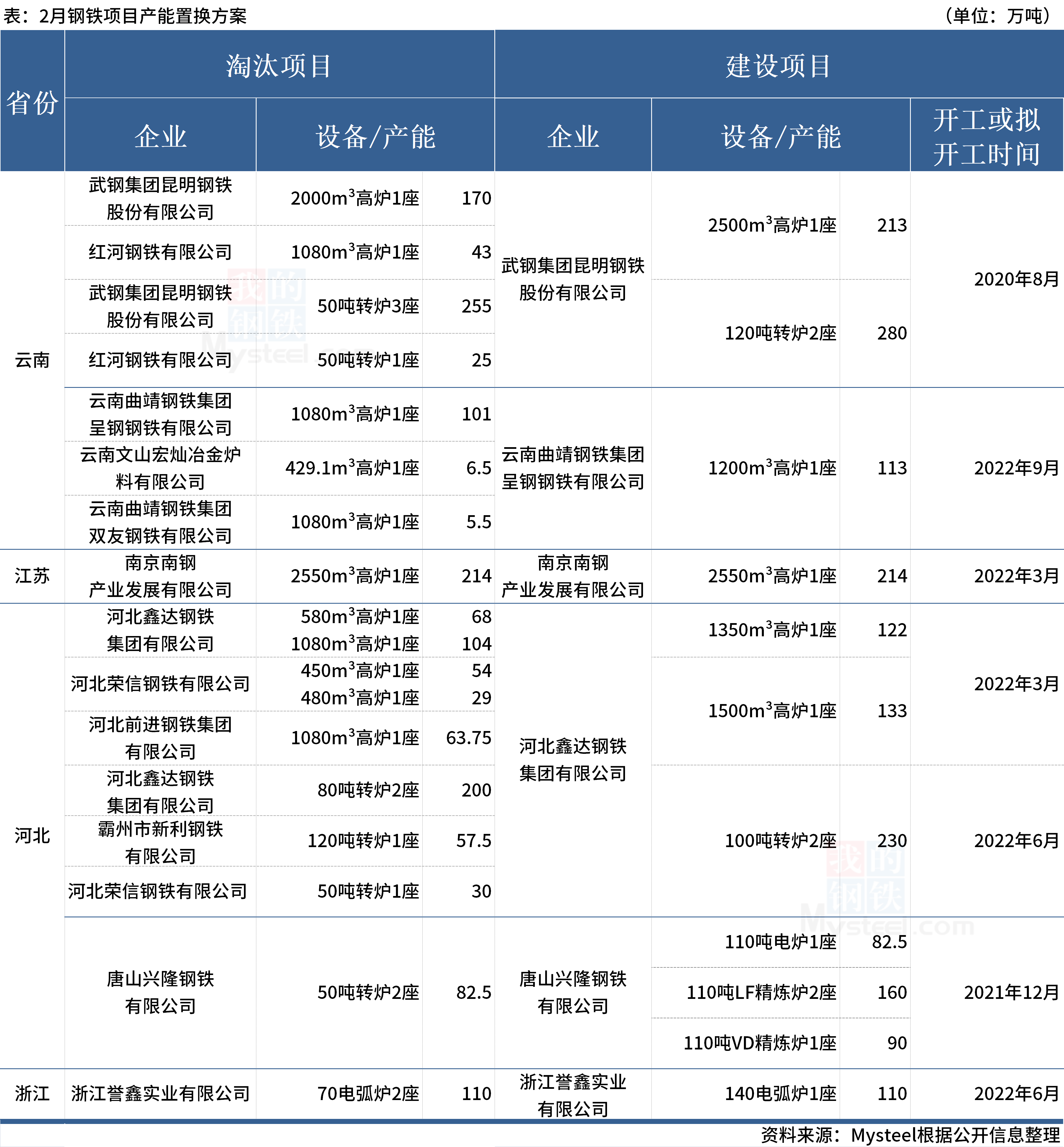 据Mysteel不完全统计,截至2022年2月21日,有6家钢厂发布钢铁产能置换方案。其中,涉及新建炼钢产能702.5万吨,新建炼铁产能795万吨;涉及淘汰炼钢产能超760万吨,淘汰炼铁产能858.75万吨。