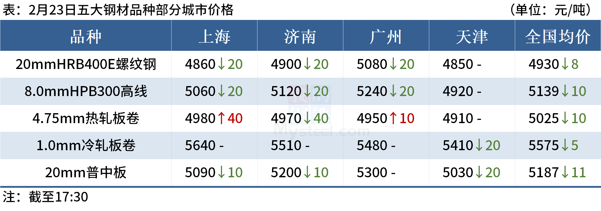 ◎ 本周唐山地区主流样本钢厂平均铁水不含税成本为3216元/吨,平均钢坯含税成本4252元/吨,周环比下调36元/吨,与2月23日当前普方坯出厂价格4650元/吨相比,钢厂平均毛利润398元/吨,周环比上调36元/吨。详情>>