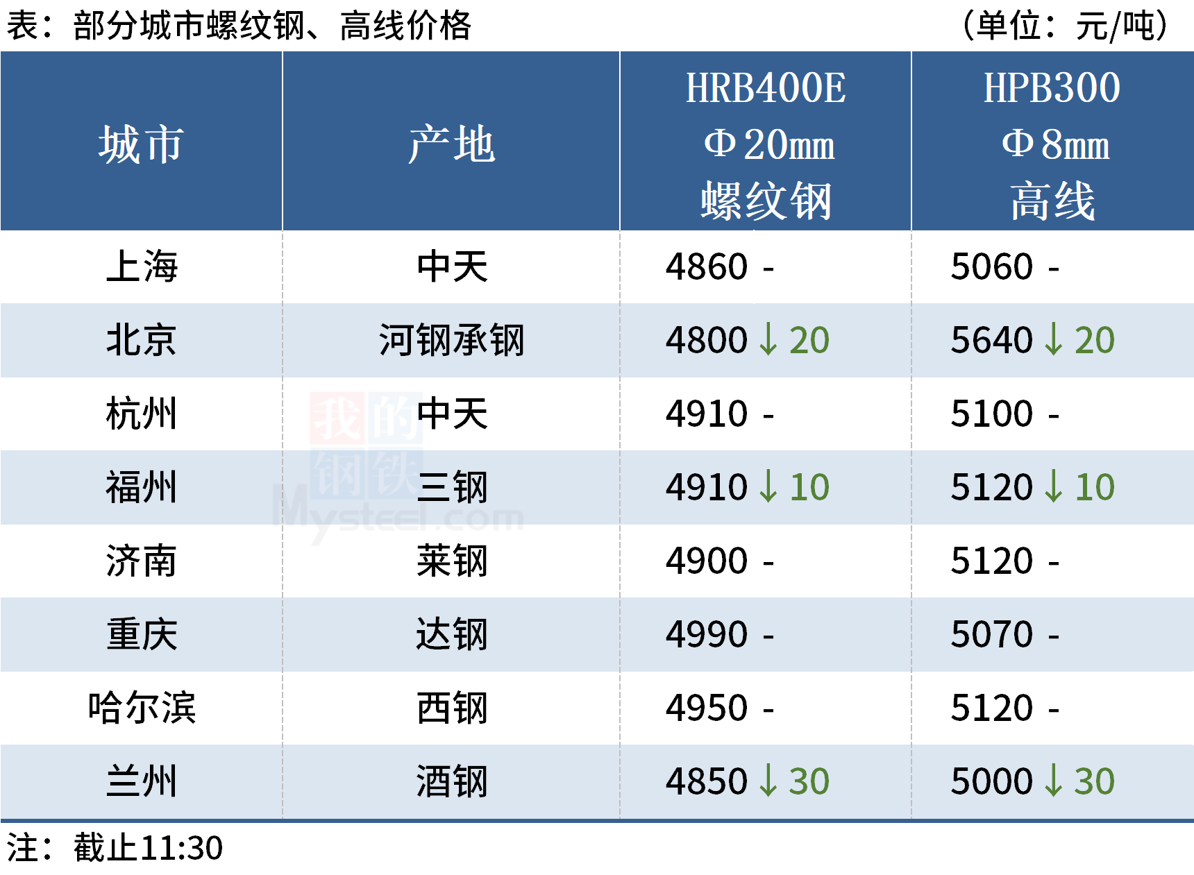 ◎北京:24日早盘建材市场价格跌20,河钢小螺纹4910-4940,大螺纹4780-4800,盘螺4980。(单位:元/吨)