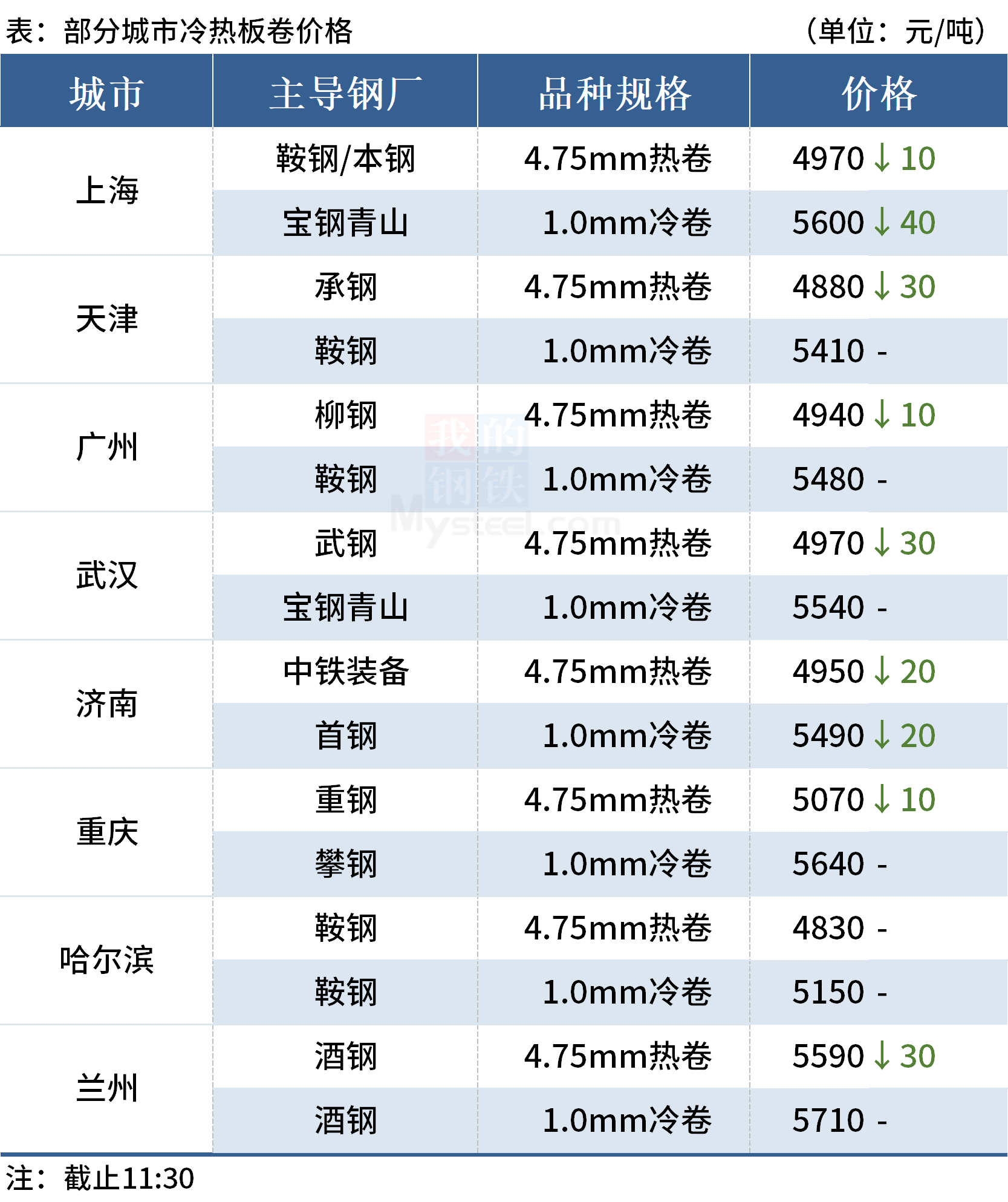 ◎乐从:24日早盘热卷市场价格下跌10,4.75以上普柳燕4940-4950,2.75普5010-5160锰5120-5140。(单位:元/吨)