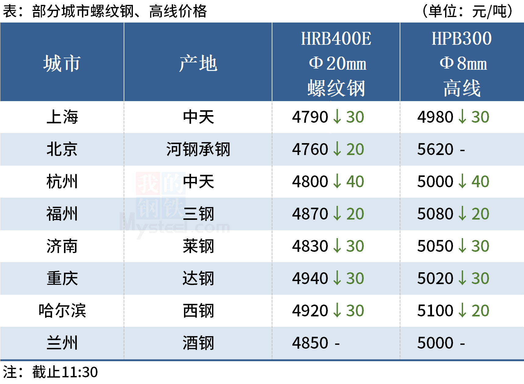◎上海:25日早盘建材市场价格整体下跌20-30。现螺纹4720-4760,西城抗震4760,其他4600-4660,兴鑫抗震4670,联鑫黄海抗震4680,盘螺4860-4980,高线亚新4720。(单位:元/吨)