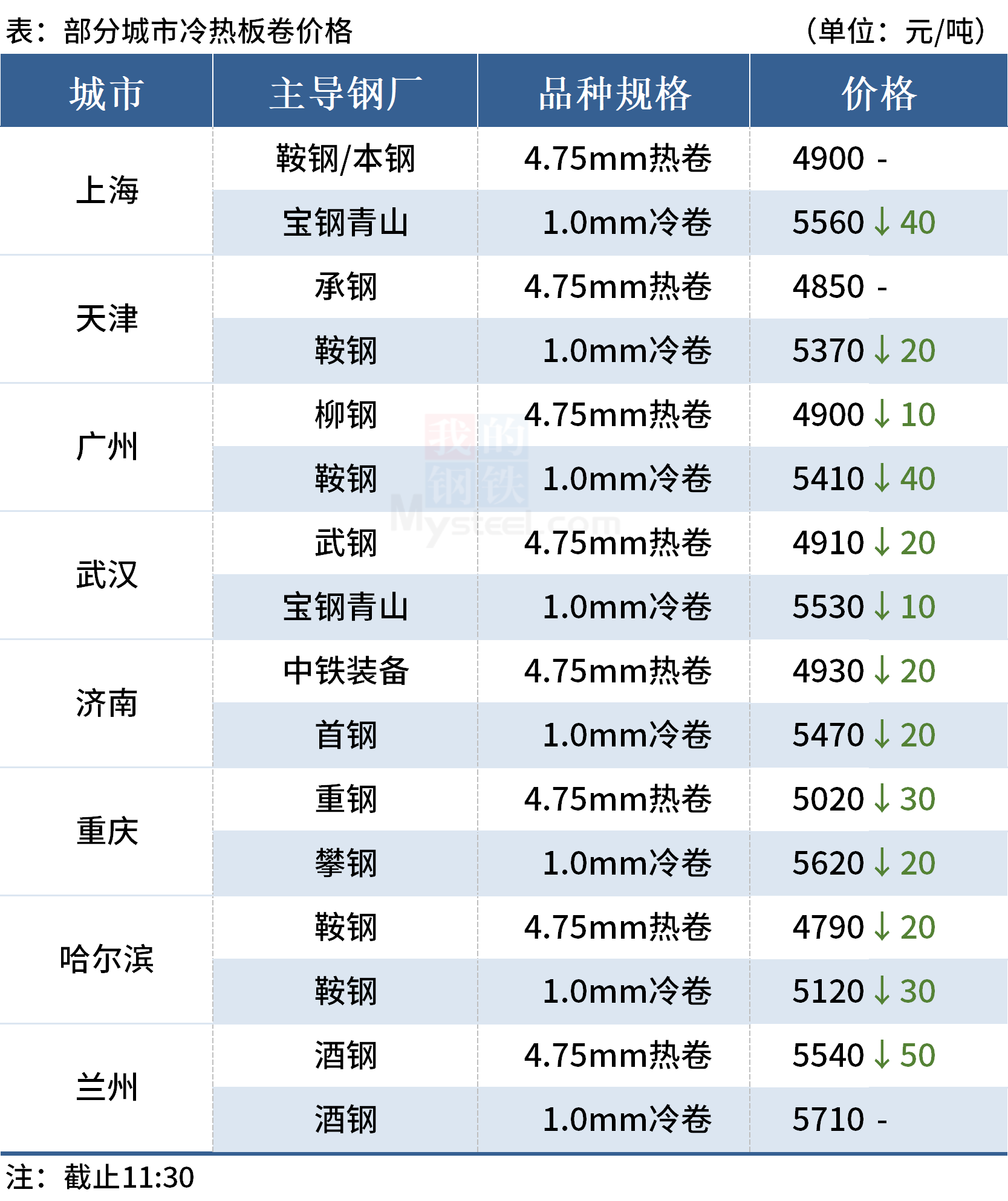 ◎乐从:25日早盘热卷市场价格下跌10,4.75以上普柳燕4900-4910,2.75普4970-5120锰5080-5100。(单位:元/吨)