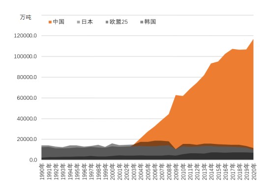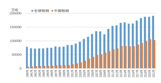 1990年-2021年全球和中国粗钢产量走势图