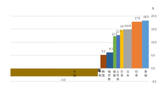 从全球粗钢产量前10名国家和地区的增长速度情况看,美国、印度的增长速度最快,分别达到了18.3%和17.8%;日本、巴西、土耳其和德国分别增长14.9%、14.7%、12.7%和12.3%;俄罗斯和韩国分别增长6.1%和5.2%;中国和伊朗分别下降3.0%和1.8%。