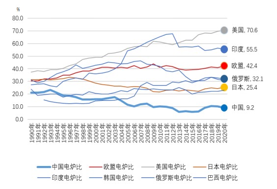 电炉钢是以电力为能源、以再生钢铁料为原料的炼钢炉生产的钢。这种短流程炼钢与以铁矿石为主要原料的长流程炼钢在原料使用上有本质的区别。从电炉钢的占比情况看,中国粗钢生产90%以上依赖长流程,即以铁矿石为主要原料的生产方式,并且受制于国产铁精矿的产量不足,对进口铁矿石的依存度很高。截止到2020年,据世界钢协(WSA)的统计数据,全球电炉钢产量占比为26.1%。主要产钢国中,美国为70.6%,土耳其为69.2%,印度电炉比为55.5%,欧盟(28)为42.4%,俄罗斯为32.1%,韩国为31.0%,日本为25.4%。中国电炉钢占比在20世纪90年代曾超过20%,但由于之后中国长流程炼钢规模迅速扩大,电炉钢占比不断被稀释,至2020年已降至9.2%。从目前情况看,美国、印度和欧盟钢铁生产对铁矿石依存度相对低很多。