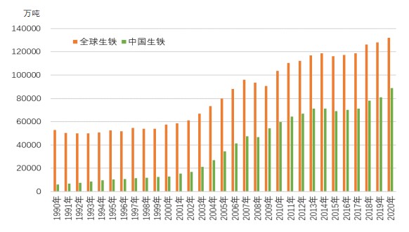 1990年-2020年全球和中国炼钢生铁产量走势图