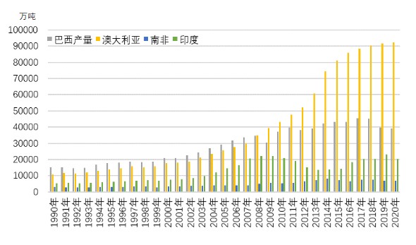 1990年-2020年主要铁矿石生产国产量情况