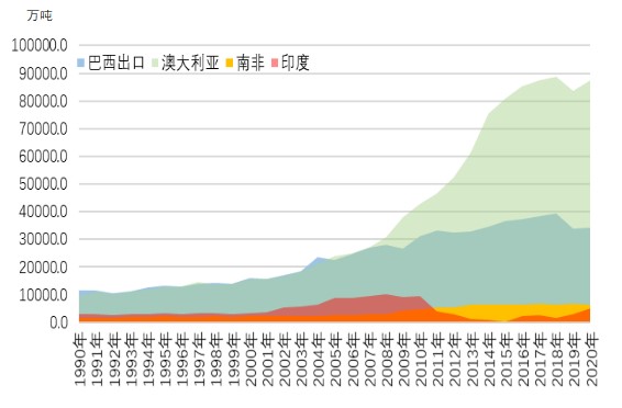 1990年-2020年主要铁矿石生产国出口情况