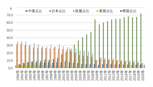 1990年-2020年主要铁矿石进口国占比变化情况