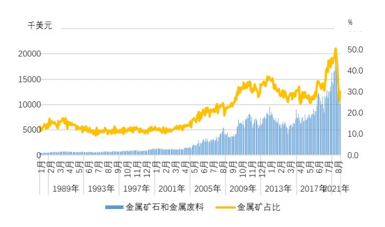 1988年至2021年澳大利亚金属矿及金属料出口情况图