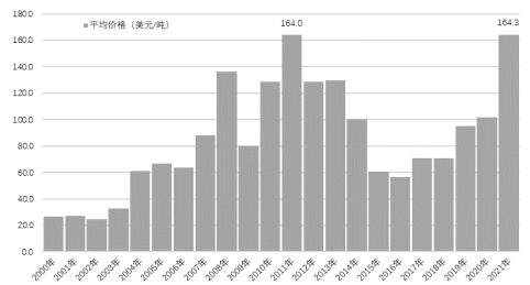 2000年-2021年中国进口铁矿石年度平均价格走势图