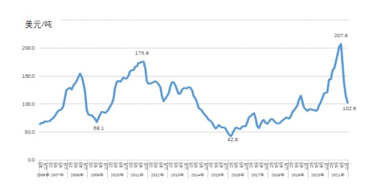 2006年1月-2021年12月进口铁矿石月度平均价格走势图