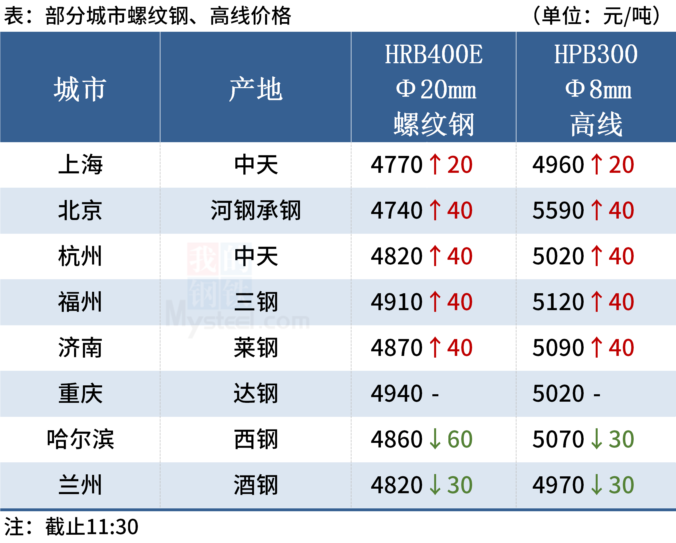 ◎上海:28日早盘建材市场价格整体上涨20。现螺纹4700-4740,西城抗震4740,其他4590-4650,兴鑫抗震4660,联鑫黄海抗震4670,盘螺4850-4960,高线亚新4710。(单位:元/吨)