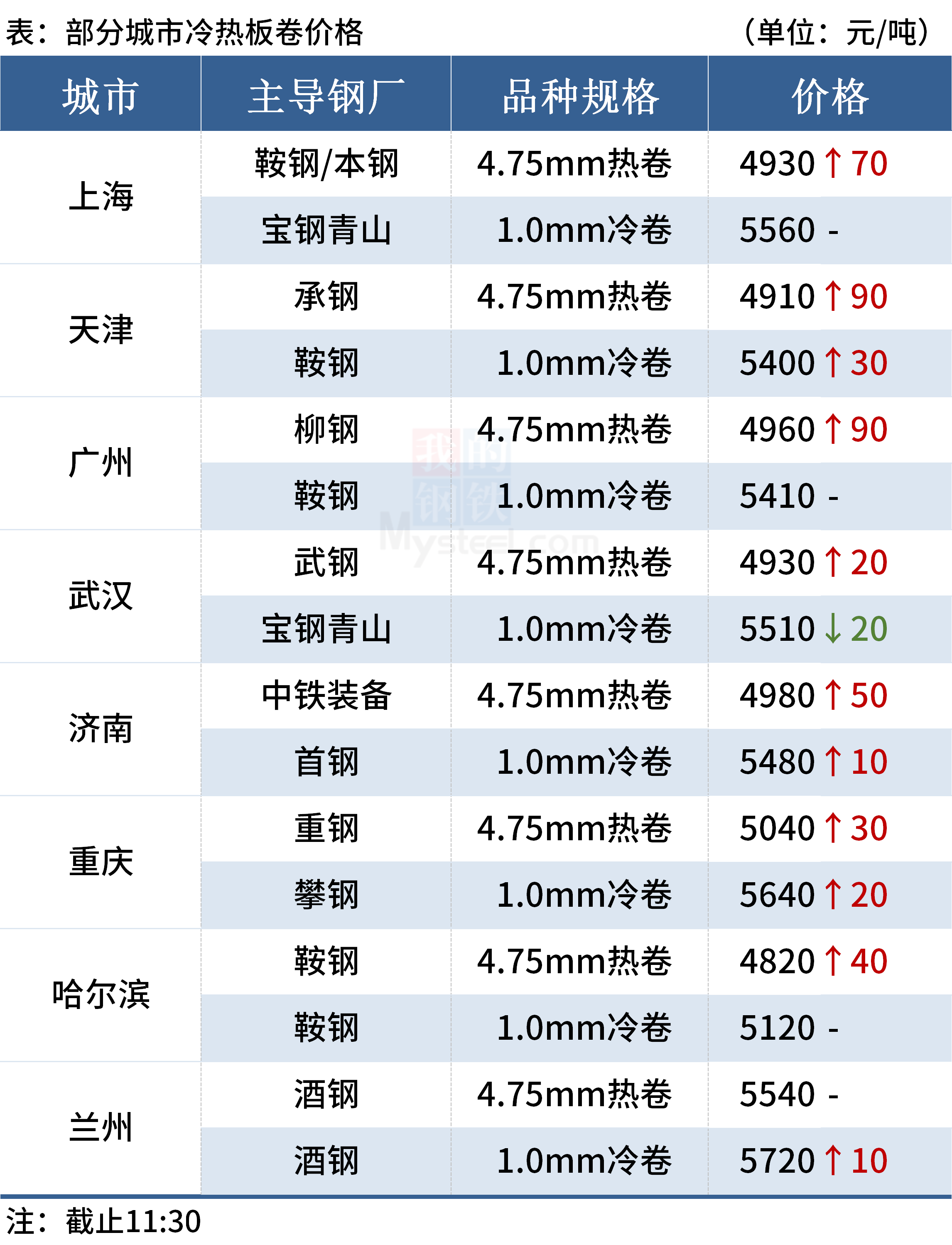 ◎上海:28日早盘热卷市场价格涨70,现主流报价1500普4910-4930元/吨,1800报5020-5030元/吨;1500锰5070元/吨,1800报5130元/吨左右,2.75Q235B报5040-5070元/吨,2.75SPHC报5070元/吨左右。(单位:元/吨)