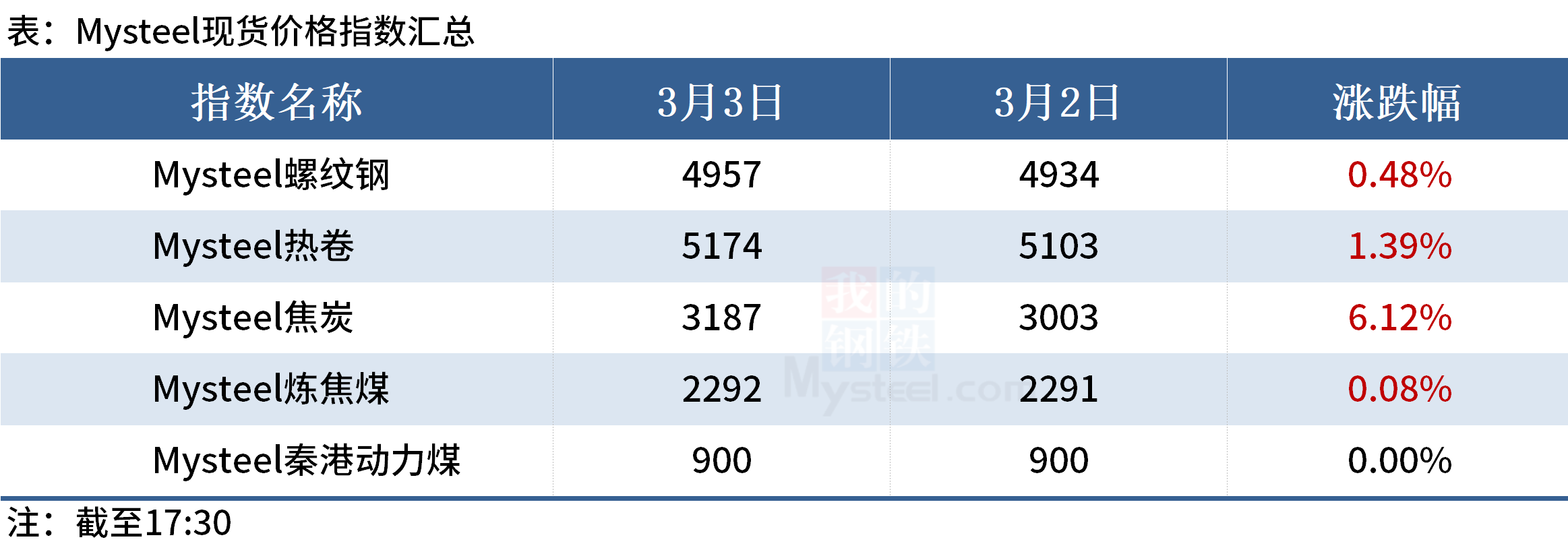 ◎ 3月3日Mysteel统计新口径114家钢厂进口烧结粉总库存3362.30万吨,烧结粉总日耗102.53万吨。原口径64家钢厂进口烧结粉总库存1572.98万吨,烧结粉总日耗51.18万吨,库存消费比30.73,烧结矿中平均使用进口矿配比86.92%,钢厂不含税平均铁水成本3123元/吨。详情>>