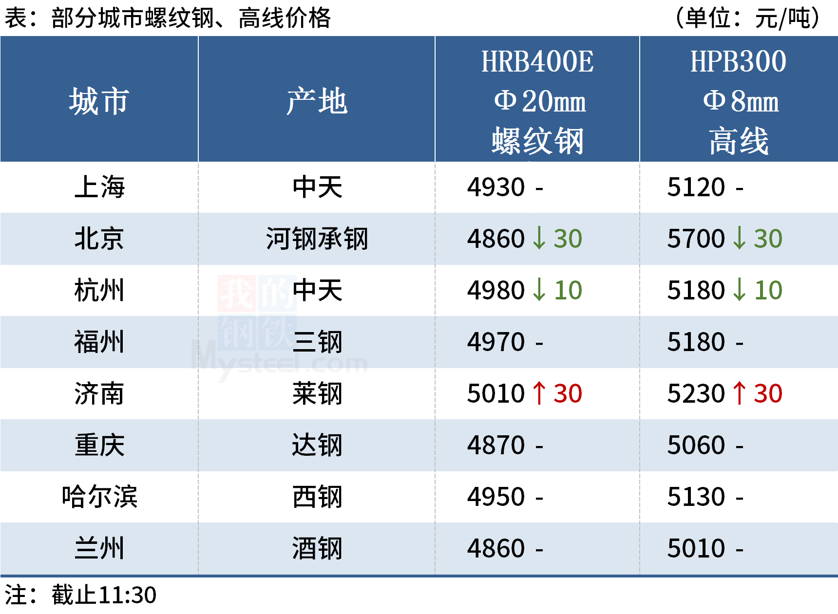 ◎杭州:4日早盘杭州优特钢市场价格涨20-30。现45#Φ30以上主流价格杭5380淮5400南5370,元立(直发)5370中天5370东方5300,40Cr杭5590淮5630;齿轮莱钢5780,铬钼建龙5990淮钢6060。(单位:元/吨)