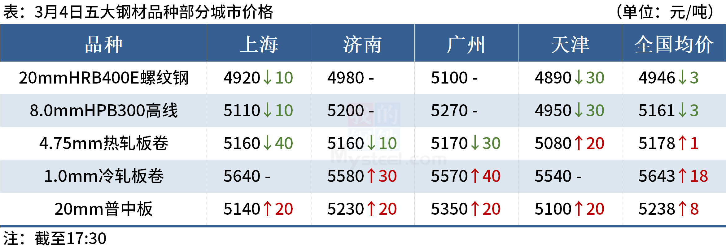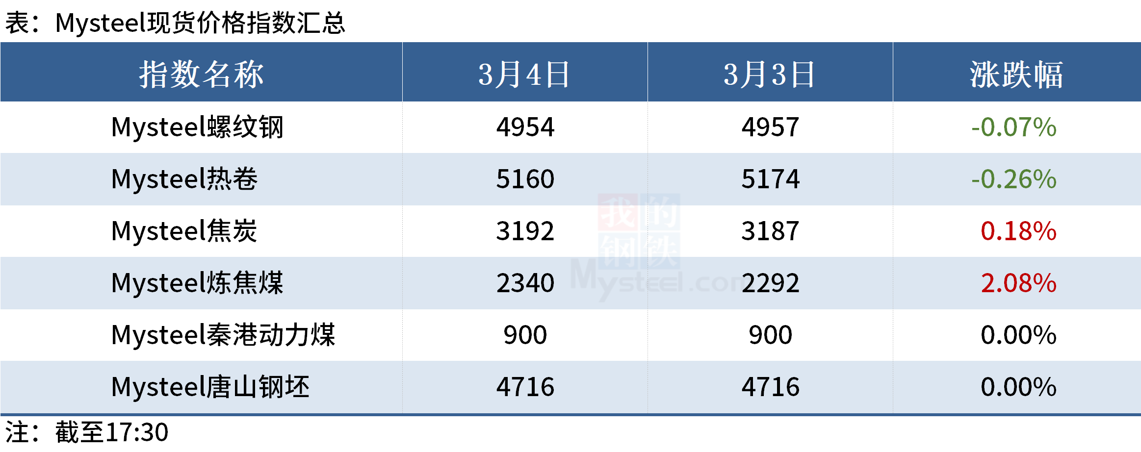 ◎ 3月4日Mysteel统计全国45港进口铁矿库存15854.52万吨,环比降32.05万吨;日均疏港量297.85万吨,增4.06万吨。47港进口铁矿石库存总量16422.52万吨,环比降库14.05万吨,日均疏港量311.75万吨,环比增4.66万吨。详情>>