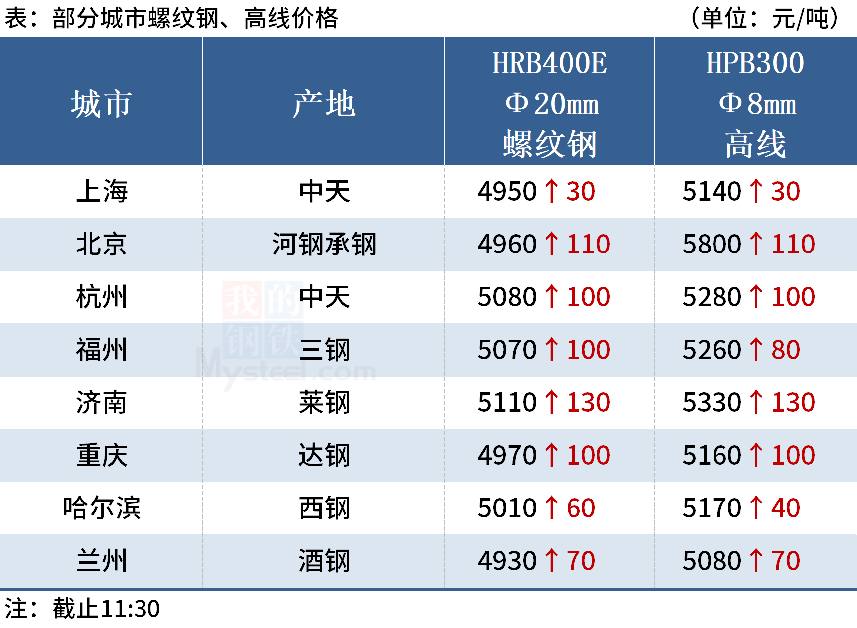 ◎北京:7日早盘建材市场价格价格大幅上涨110,河钢小螺纹5040-5060,大螺纹4940-4960,盘螺5140。(单位:元/吨)