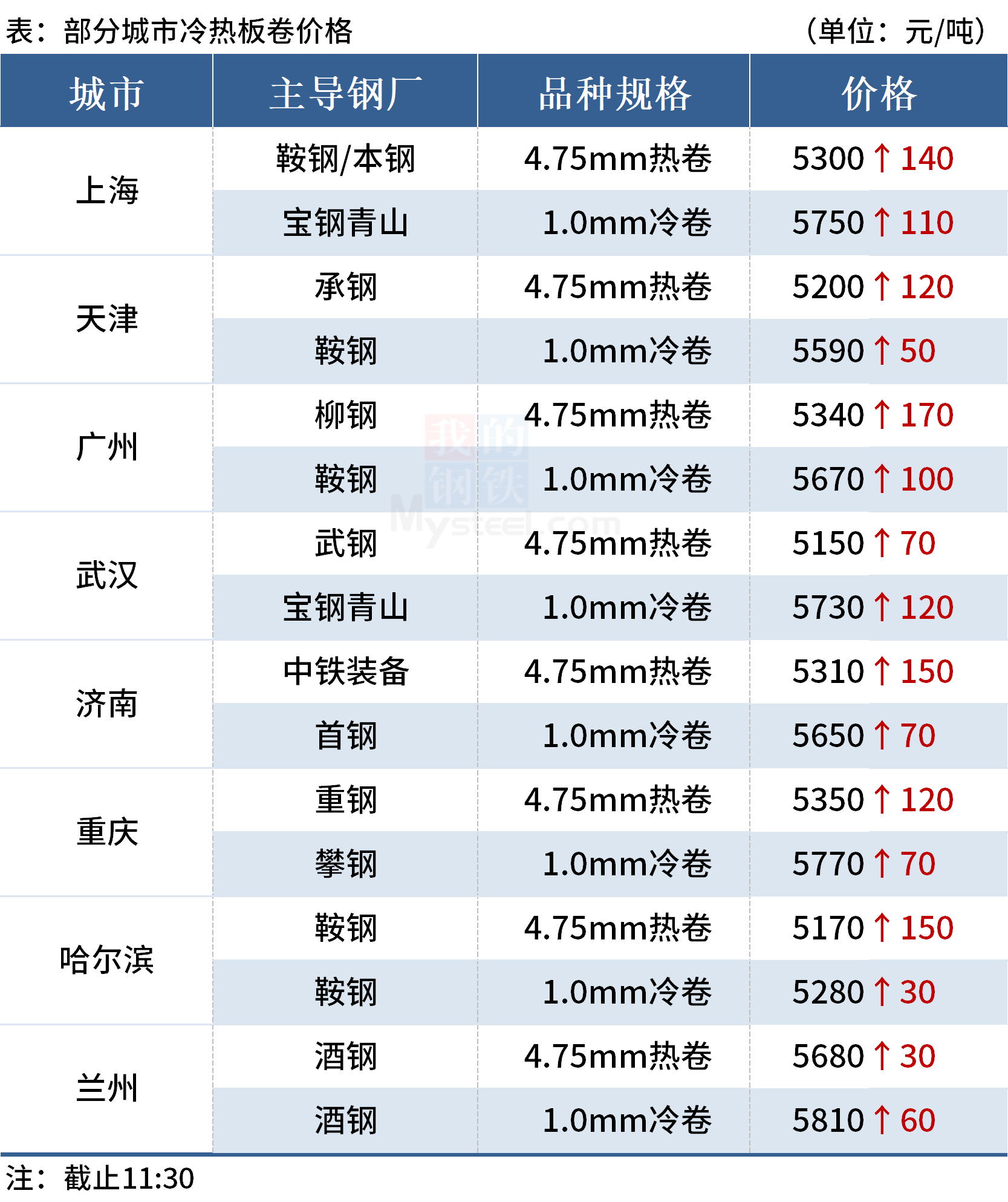 ◎武汉:7日早盘冷轧市场价格上涨120,1.0宝钢青山卷5730,1.5卷5670,3.0卷6220。(单位:元/吨)