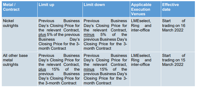 首先,对于单日涨跌幅限制,LME067号通知明确,镍合约单日涨跌幅限制设置为5%,其他基本金属为15%。此外,通知表示,触及任何价格上限都不会导致自动暂停交易;并且会在3月16日交易结束时,据市场情况来决定是否会调整单日涨跌幅限制。LME预计,随着市场情况常态化,镍合约的单日涨跌幅限制也将达到和其他基本金属一样的15%。