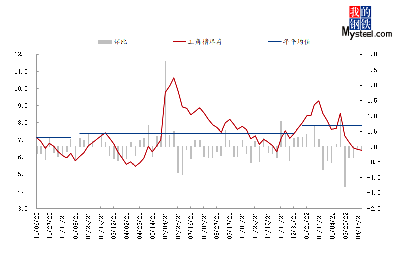 2022年4月21日上海市场型材仓库进行同口径调查统计,工角槽钢库存6.39万吨,较上周减少0.07万吨。