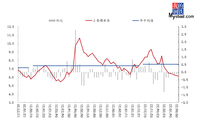 2022年5月12日上海市场型材仓库进行同口径调查统计,工角槽钢库存6.12万吨,较上周减少0.06万吨。