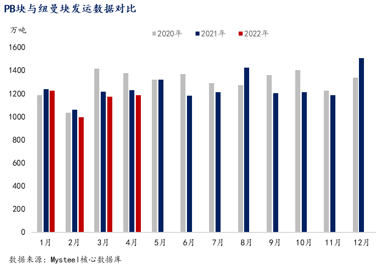 从供应的角度来看,一季度往往是矿山发运较为薄弱的季度,而这一情况在2022年第一季度表现尤为明显。依据海外矿山发运数据可以发现,2022年1月到3月主流块矿资源—PB块与纽曼块的发运量与往年同期相比是偏低,尤其是与2020年同期相比这一变化趋势更加明显。到了4月份虽然这两者的整体发运量有所回升,但是依旧是弱于往年同期。发运上的薄弱也直接导致了市场中可用于贸易的块矿资源相对较为有限,这直接为块矿溢价提供了支撑。