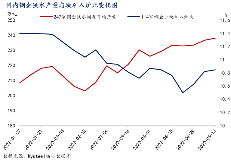 截止到5月13日,247家钢铁企业周度日均铁水产量为238.18万吨,较4月1日周度日均产量226.1万吨上涨12.08万吨,涨幅约为5.34%。同一时期,Mysteel114家钢铁企业的块矿入炉比从10.87%窄幅震荡至10.85%,这表明国内钢厂的块矿入炉比则基本上是处于一个窄幅徘徊的水平,基本未发生较大变化。这种程度的窄幅震荡在铁水产量增长幅度较为明显的背景下导致实际的块矿需求依旧是处于一个增加的态势,发运上的薄弱与需求上的强劲两者结合直接为块矿溢价在基础面上提供了支撑点。