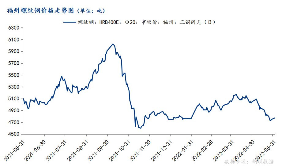 从主流钢厂结算价来看,本月持续下跌。三钢2022年5月26日起结算价执行螺纹钢4800元/吨,高线4850元/吨,盘螺4950元/吨,螺纹钢、线盘结算价较上月底下调250元/吨。