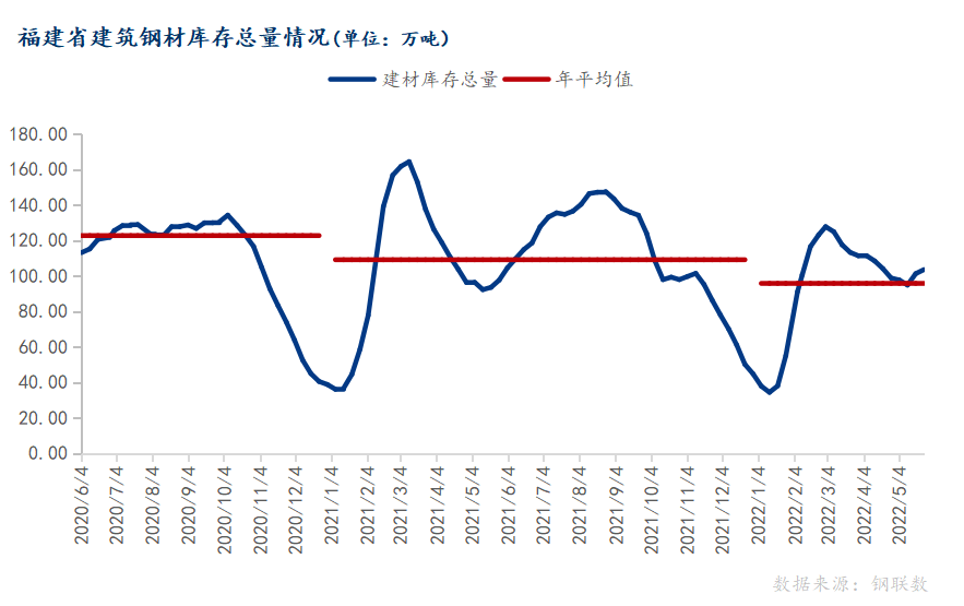 据Mysteel统计数据显示,6月1日福建省建材总库存合计106.72万吨,与上周相比增加3.24万吨,其中闽东47.32万吨、闽南49.7万吨、闽西北9.7万吨。环比4月底增加7.99万吨,增幅8.09%;同比去年5月底增加2.26万吨,增幅2.16%。从数据可以看出,今年5月上旬库存开始由降转升,较去年提前半个月。